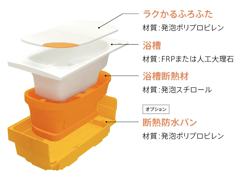 魔法びん浴槽(TOTO)浴槽を断熱材で包み込んだ魔法びんのような構造で、お湯の温かさを保ちます。