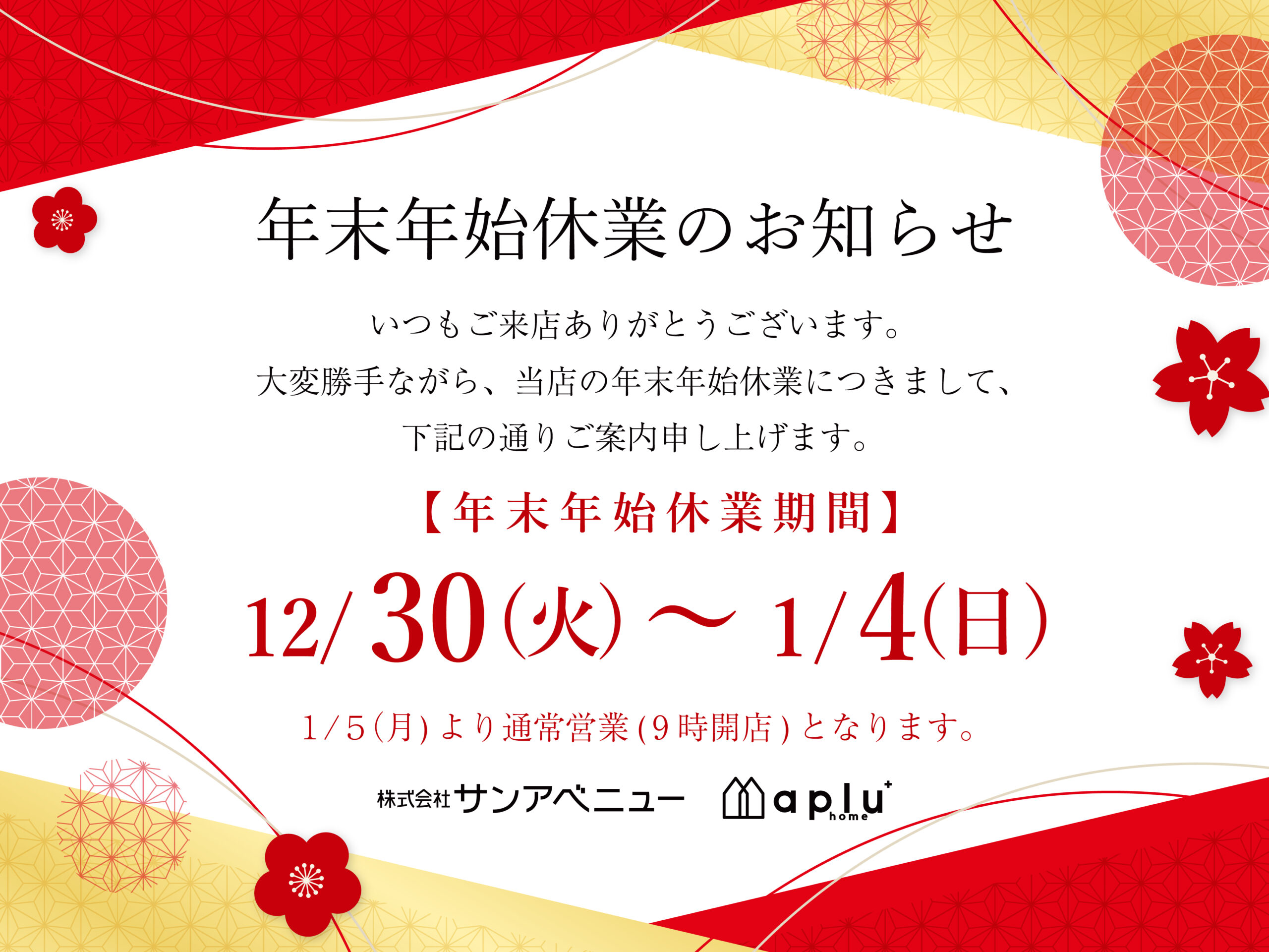 年末年始は2025年12月30日(火)~2026年1月4日(日)の間を休業いたします。