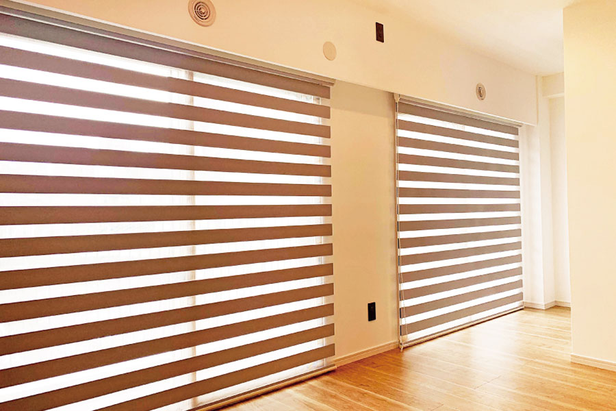 視線を遮り、朝日や夕日の調光のバランスをつくる。電動シェードだからスイッチ一つで一括操作も可能。自分だけのカスタムオーダーができます。